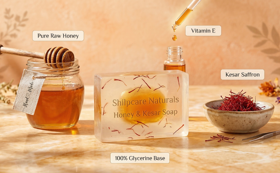 Shilpcare Honey & Kesar Soap brightens skin and reduces dark spots. SLS & paraben-free for soft, glowing skin.